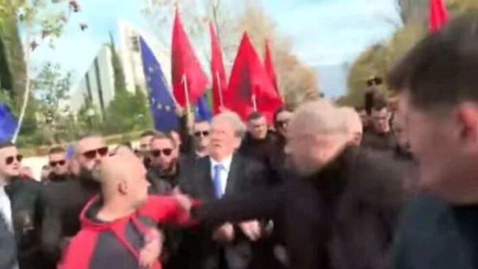 Ish-kryeministri Sali Berisha është qëlluar me grusht nga një person, teksa i është bashkua protestës së opozitës.