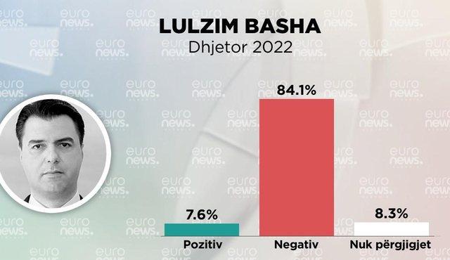 84.1% e shqiptarëve kanë mendim negativ për ish-kreun e PD-së Lulzim Basha. Vetëm 7.6% e shqiptarëve kanë mendim pozitiv dhe 8.3% nuk janë përgjigjur.