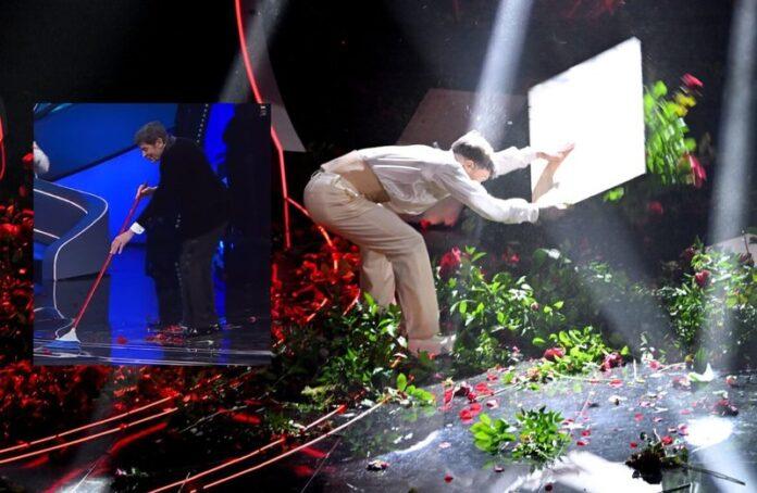 Menjëherë pas kësaj, legjenda e muzikes italiane Gianni Morandi hyn me një fshesë dhe përpiqet të pastrojë rrëmujën e luleve të shpërndara nëpër skenë.