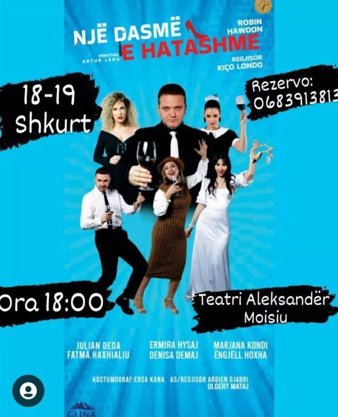 “Një dasmë e hatashme”është një komedi brilante, që e sjell në skenën teatrore regjisori Kiço Londo. Prodhim i Teatrit Shëtitës “Çajupi”, shfaqja teatrore në fundjavë do të jetë për publikun në teatrin “Aleksandër Moisiu”në Durrës. Vepra e autorit Robin Hawdon me regji nga Kiço Londo pas suksesit, që pati më parë në qytetin e Elbasanit mbrëmjet e datave 18 dhe 19 shkurt do të jetë në Durrës. Një tekst mahnitës, kostume fine, aktorë të mrekullueshëm në këtë shfaqje teatrore. Julian Deda, Fatma Haxhialiu, Ermira Hysaj, Marjana Kondi, Denisa Demaj dhe Engjëll Hoxha vijnë me role nëkomedinë “Një dasmë e hatashme”. Regjisori Kiço Londo tregon se ajo që e ka ngacmuar më shumë për të sjellë këtë komedi brilante në skenëështë linja e dashurisë.“Arsyeja e parë pse zgjodha këtë vepërështë koherenca, që ka me realitetin shqiptar. Ngjarjet në vepër përshkruhen nga një kaos, nga mungesa e qetësisë, nga zgjedhjet gabim, nga çorientimi psiqik dhe fizik i personazheve dhe vetëm ndërhyrja e fortë e dashurisë bën që situata të kthehet në normalitet. Por ajo që më ka ngacmuar më shumëështë linja e dashurisë sëveprës. Pra përveçse është një komedi e bukur, e shpejtë, me karaktere të fuqishme, me dialog brilant, vepra ka edhe një linjë të dashurisë romantike. Dashuria zgjidh gjithçka”, shprehet regjisori Londo, i cili thotë se arsyeja e dytë pse e mori këtë vepër është përkthimi brilant i Artur Lenës. Në këtë komedi regjisori Londo ia ka besuar rolet artistëve të njohur, por dhe emrave që sipas tij janë surprizues për publikun. “Së treti doja të provoja dy gjëra që nuk i kisha provuar më parë. E paravendosja e Julian Dedës në personazhin kryesor të veprës dhe së dyti thirrja e dy aktoreve njëkohësisht që nuk vijnë nga bota eteatrit, por luajnë teatër për herë të parë siç është FatmaHaxhialiu dhe DenisaDemaj, që do të jenë surprizuese për publikun në sallë”, tregon regjisori Londo.