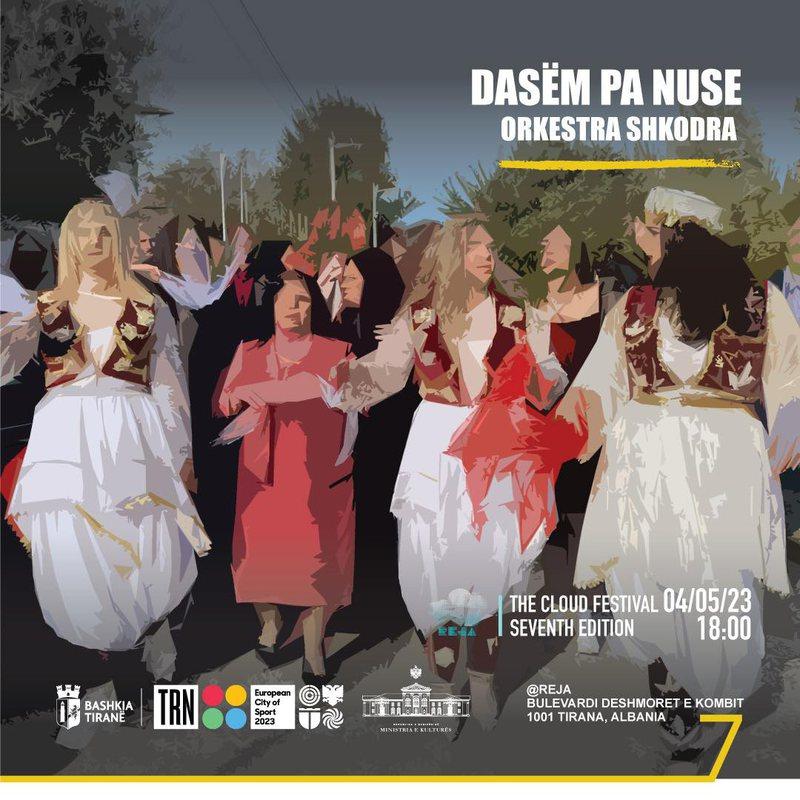 “Dasëm pa nuse” vjen si performanca që do të ngrejë siparin e edicionit të 7-të të “Cloud Fest”. Kjo do të jetë një performancë, që do të sjellë dasmën tradicionale shkodrane, me këngët dhe gjithë atmosferën dhe gjallërinë që e karakterizon. “Orkestra Shkodra”, të cilët së fundmi kanë publikuar dhe albumin muzikor “Si bylbylat në pranverë”, do të vijnë në “Cloud Fest” për të elektrizuar skenën. Pas kësaj atmosfere, mbrëmja do të vijojë brenda instalacionit Reja, me performacën e dancit bashkohor “Sub Rosa Dictum” nga kompania Was Bleibt Collective/ Gentian Doda koreografi. Në vijim gjatë festivalit vijojnë aktivitete të ndryshme, ku përmendim dhe “Karnavale” Arapët e Polenës më 6 maj. “CloudFest” do të sjellë gjithashtu një traditë të hershme të folklorit shqiptar, në një performance unike të artistes që i është përkushtuar ruajtjes së kësaj tradite. Me origjinë nga Shkreli i Malësisë së Madhe, Lumturije Nonaj do të jetë në festival më 7 maj. Në festival do t’i këndojnë Tiranës, artistët Rik Buneci, Iris Bega, këngëtare e Ansamblit Shtetëror dhe ansamblit me famë ndërkombëtare “Tirana Allstars” së bashku me Fatjon Konxhollin. Shoqëruar nga instrumentistë veteranë për të dhuruar e festuar traditën e mrekullueshme muzikore “Tironse”. Vjen në “CloudFest” për të performuar më 8 maj, ansambli “Pulse of Berat”, i përbërë nga këngëtarët dhe instrumentistët virtuozë nga Berati. Marco Castelli, saksofonist dhe kompozitor, i cili e ushtron veprimtarinë e tij jo vetëm në botën e xhazit, vjen për herë të dytë në “Cloudfest”, duke sjellë përvojën fantastike të shfaqjes së filmit pa zë të shoqëruar me kolonë zanore live me saks dhe elektronikë. Marco sjell një tjetër kryevepër italiane të filmit pa zë, filmin Cabiria (1914) ,i cili bazohet në Siçilinë e lashtë, Kartagjenë dhe Cirta gjatë periudhës së Luftës së Dytë Punike (218-202 para Krishtit). Në radhët e artistëve dhe ansambleve do të jetë dhe grupi folklorik i Vlorës “Bilbili” i krijuar në vitin 1994. Lorena Alvarez gjithashtu është një prej artisteve në festival, ku në vijim janë të tjerë artistë shqiptarë dhe të huaj deri më 20 maj.