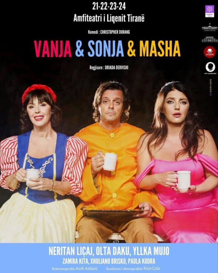 Komedia “Vanja & Sonja & Masha” shkruar nga Christopher Durang me regji nga Driada Drvishi është shfaqur në skena të ndryshme teatrore, por këto net vjen dhe në amfiteatrin liqenit në Tiranë. Komedia do të shfaqet dhe në datat 22, 23 dhe 24 shtator në mbrëmje për publikun, ku aktorët Neritan Liçaj, Olta Daku, Yllka Mujo, Zamira Kita, Paola Kodra dhe Xhuliano Brisku bëhen bashkë në këtë komedi bashkëkohore të Durang nën regjinë e Driada Dervishit. Kostumet nga Ardi Asllani, realizimi skenografik Kiço Çala, përzgjedhja muzikore Metila Dervishi. Ky aktivitet është një nga stacionet e “KultArt” 2023, mbështetur nga Ministria e Kulturës. Komedia nga Durang fitoi “Tony Award for Best Play” në 2012. Në vitin 2018 “Vanja & Sonja & Masha” me regji nga Driada Dervishi merr çmimin shfaqja më e mirë në festivalin “Koko Fest” në Korçë. Regjisorja Dervishi po me këtë shfaqje në çmimet “Kult” vlerësohet si “Regjisorja e Vitit”, ku dhe aktorja Olta Daku vlerësohet nga çmimet “Kult” si “Aktorja më e mirë e vitit” në rolin e Sonjës. Në vepër janë dy motra dhe një vëlla. Një prej motrave dhe vëllai, Sonja dhe Vanja kanë gjithë jetën që janë kujdesur në një shtëpi në provincë për prindërit, pa mundur të krijojnë një jetë të tyre. Masha motra e madhe që i ka ndihmuar financiarisht nuk është marrë asnjëherë me prindërit dhe shtëpinë, por është një superaktore mjaft e paguar dhe e njohur, e cila vjen për një festë me kostum për të takuar dhe familjen. Këtu fillon e gjithë komedia, sepse ajo vjen për të shitur shtëpinë. Pas kësaj fillon tensioni dhe konflikti mes motrave dhe vëllait. Pjesët e Durang janë vënë në të gjithë Amerikën.