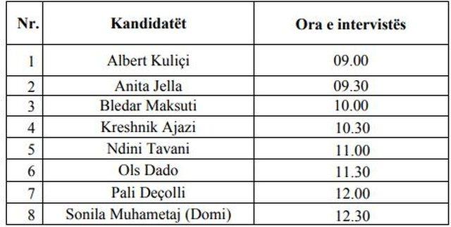 Intervistat me kandidatët do të regjistrohen me audio dhe video si dhe do të zgjasin jo më shumë se 30 minuta për secilin kandidat (nga të cilat 10 minuta për prezantimin individual të kandidatëve dhe 20 minuta për pyetjet/përgjigjet nga anëtarët e Këshillit dhe përfaqësuesit e misionit ndërkombëtar të OPDAT).