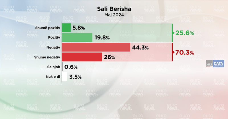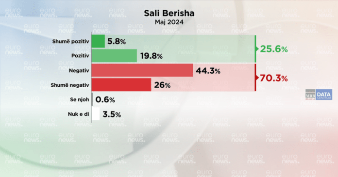 Në janar pëlqyeshmëria për Sali Berishën ka qenë (28.7%) ndërsa sot është (25.6 %). Mendimi negative në janar 2024 ka qenë (67.5 %) dhe sot është (70.3 %). Nga analiza e të dhënave demografike Sali Berisha pëlqehet më shumë nga meshkujt ( 30.9%) sesa nga femrat (19.4 %.)./ Euronews Albania