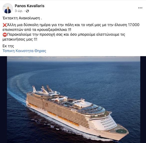Postimi në Facebook, ku Panos Kavallaris njofton mbërritjen e 17 mijë turistëve përnjëherësh ka shkaktuar reagime të ashpra nga banorët e Santorinit dhe politika në Greqi. “Një ditë tjetër e vështirë për qytetin dhe ishullin tonë me ardhjen e 17 mijë vizitorëve nga anijet turistike. Kërkojmë vëmendjen tuaj dhe sa të mundemi të reduktojmë lëvizjet!”, thuhet në mesazhin e tij drejtuar banorëve të Santorinit, firmosur nga “Bashkësia Lokale Thira”.