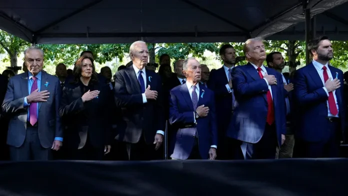 Presidenti Joe Biden, ish-presidenti Donald Trump, zëvendëspresidentja Kamala Harris dhe senatori i Ohajos, JD Vance u panë duke qëndruar krah për krah të mërkurën gjatë ceremonisë së përkujtimit të 11 shtatorit në Ground Zero.