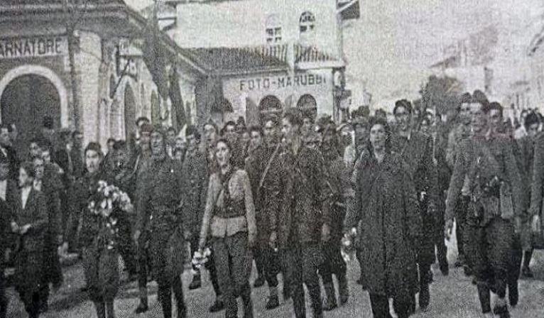 “O Zot, në kjoftë e mundun, largoje këtë kelk prej meje”! Lutja ishte kjo, por u bâ vullnesa e Zotit! 29 nandori gdhini ditë e zymtë dhe e ftohtë. Në orën 10.30 – 11.00, nëpër rrugët kryesore të qytetit hyni brigada partizane, e prime prej Major Gjin Markut: flamurit kombtar, që valvitnin përpara, i kishin shtue nji hyll të kuq.