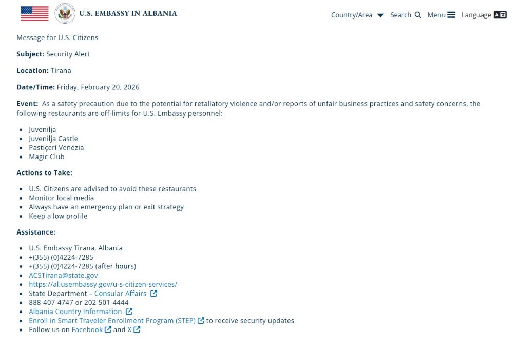 Ambasada e Shteteve të Bashkuara në Tiranë ka lëshuar një njoftim të rrallë sigurie, duke këshilluar qytetarët amerikanë të shmangin disa lokale në kryeqytet për shkak të rrezikut të mundshëm të dhunës hakmarrëse dhe shqetësimeve për sigurinë. Në paralajmërimin e shpërndarë përmes kanaleve zyrtare, ambasada u bën thirrje shtetasve amerikanë të tregojnë kujdes të shtuar, të shmangin ambientet e përmendura dhe të monitorojnë njoftimet për përditësime të mëtejshme mbi situatën.